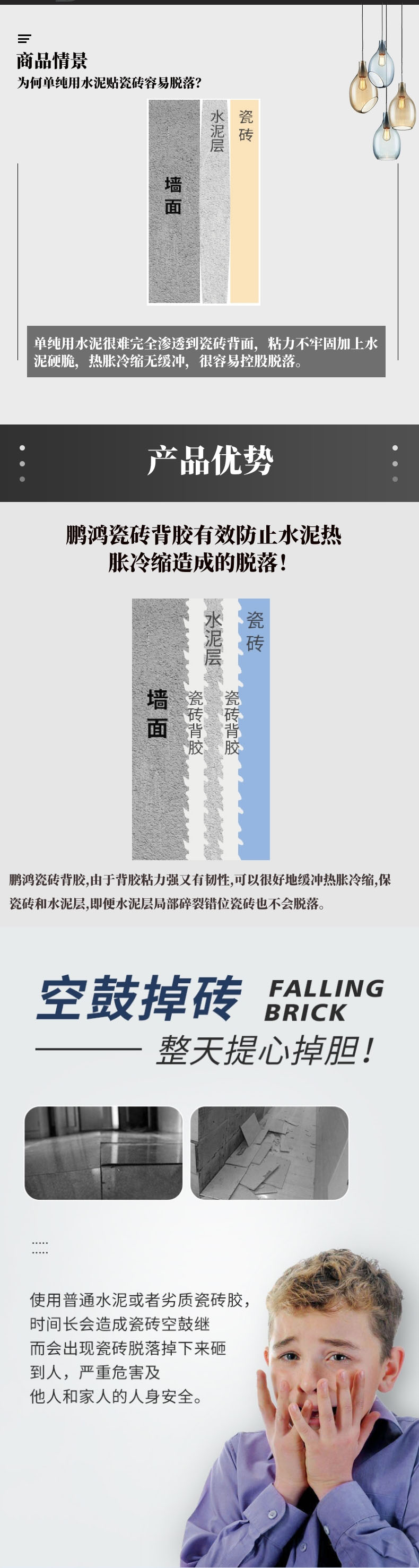 用于各类瓷砖铺贴中瓷砖背面处理;如玻璃化砖、仿古砖、文化砖、抛光砖、人造石、天然大理石、瓷片等。